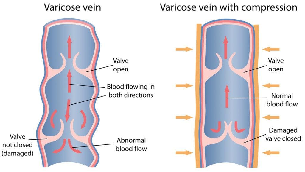 Compression stockings improve the signs and symptoms of various conditions of venous disease by providing graduated compression therapy to help control leg swelling and discomfort. They are designed to provide support to the legs and veins, assist with circulation, and minimize swelling. The compression is graduated, with the strongest support starting at the ankles and gradually decreasing towards the top of the garment. This gradual support works in conjunction with the pumping action of the calf muscles, which also assist with circulation.