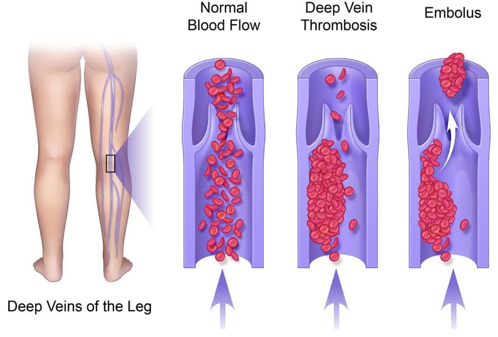 DVT can lead to post-thrombotic syndrome, another kind of vein blockage that interferes with blood flow. This complication, which occurs in up to two-thirds of people with DVT, causes pain, fluid build-up, change in skin color and skin ulcers.