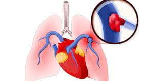 Pulmonary embolism is a blockage in an artery in the lungs. It occurs when a blood clot – usually from the legs (deep vein thrombosis) – breaks off, is carried through the bloodstream and lodges in the arteries in the lungs. This blocks the flow of blood through the heart, which may lead to death.